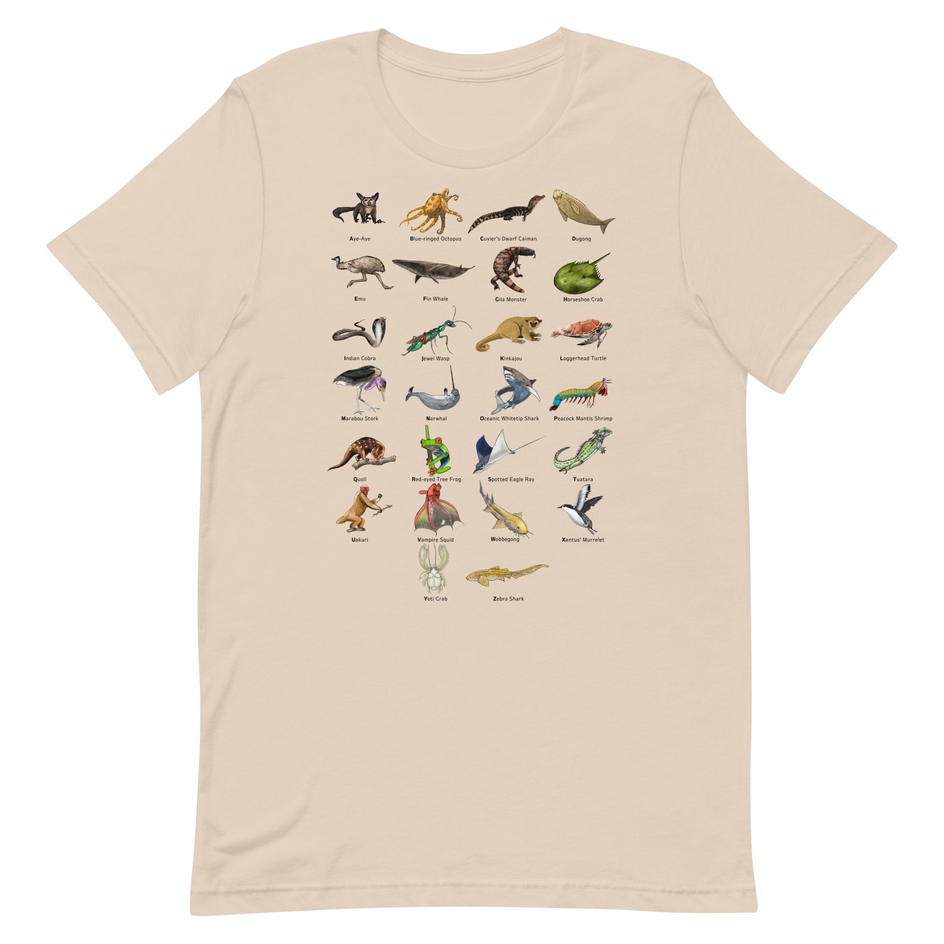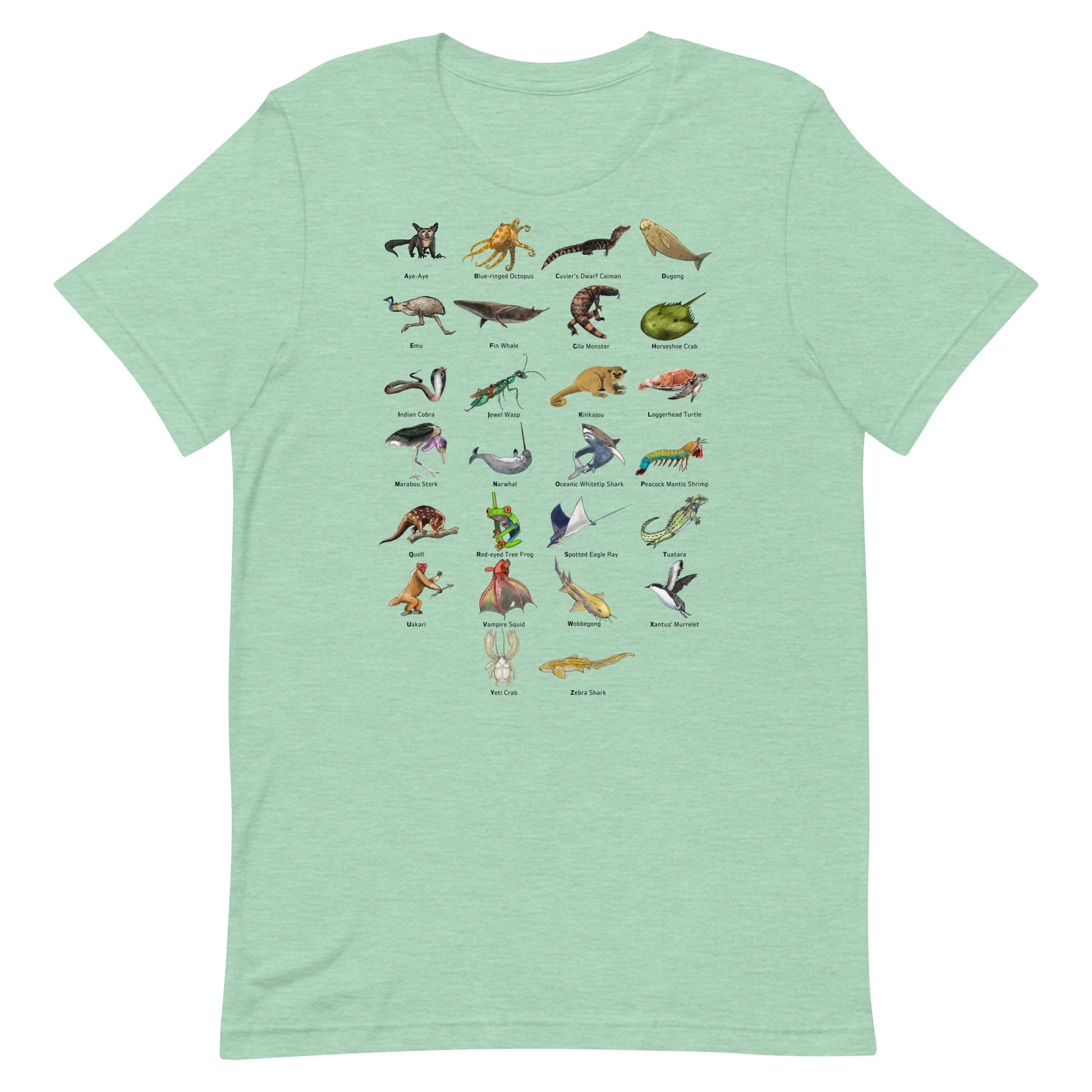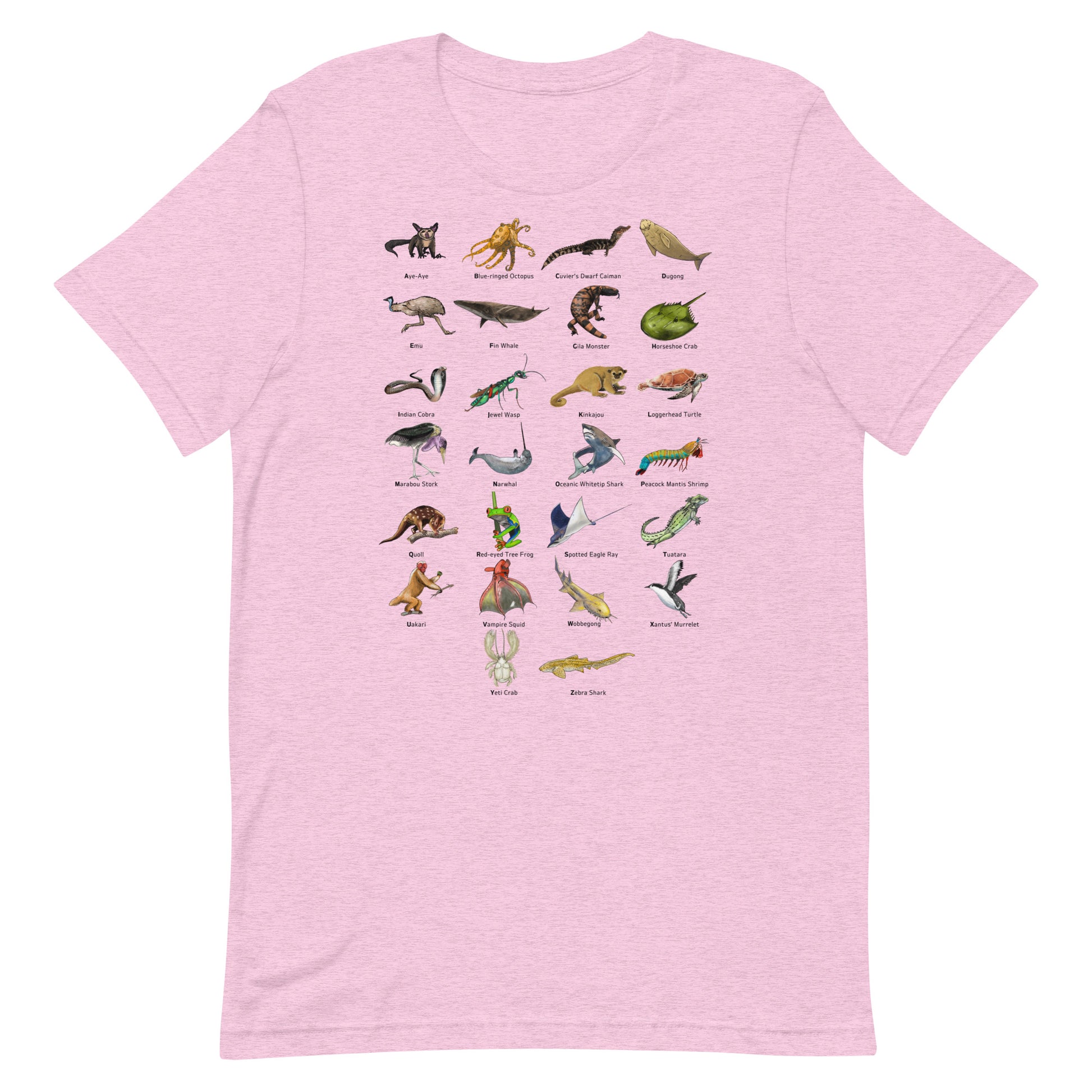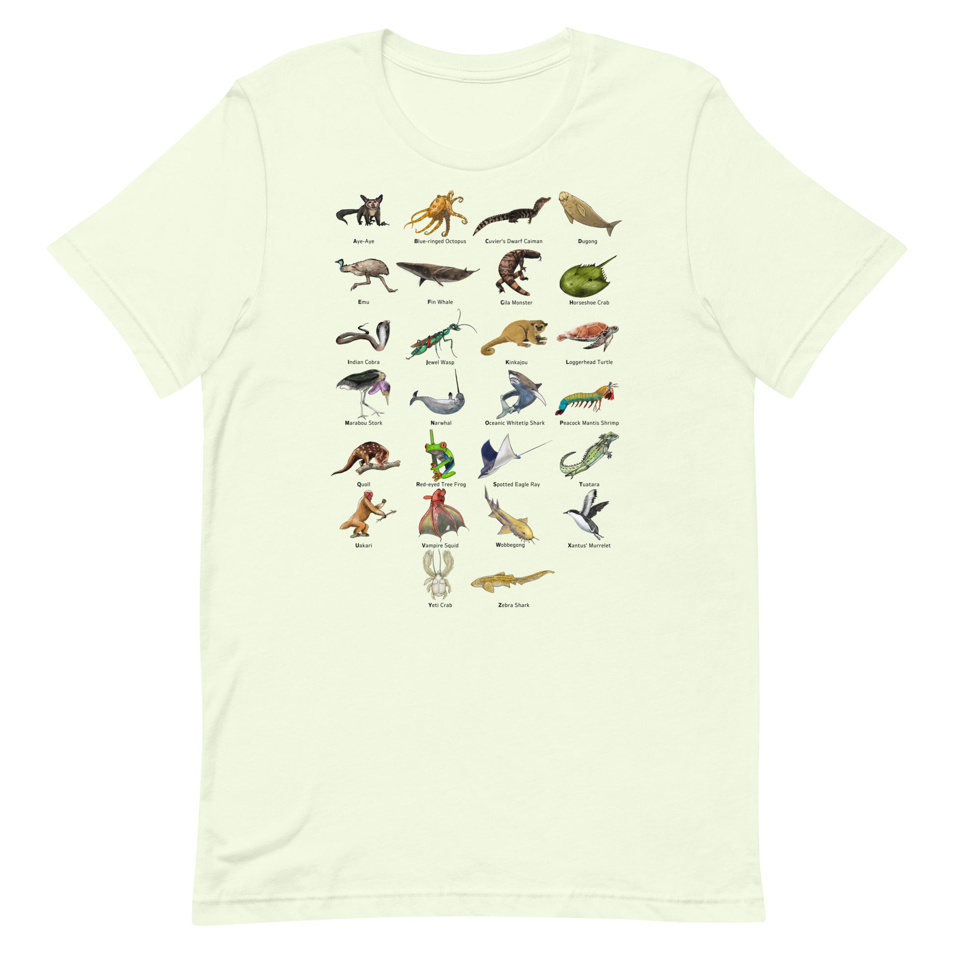 Introducing our extraordinary Animal Alphabet T-Shirt! Explore the world of wildlife like never before with this unique and educational design. Each letter of the alphabet is represented by a fascinating and lesser-known creature, from the mysterious Aye-Aye, known for its elongated middle finger used for insect hunting, to the cunning Jewel Wasp, which turns cockroaches into zombie slaves, and the enigmatic Vampire Squid, a deep-sea dweller with its otherworldly appearance.