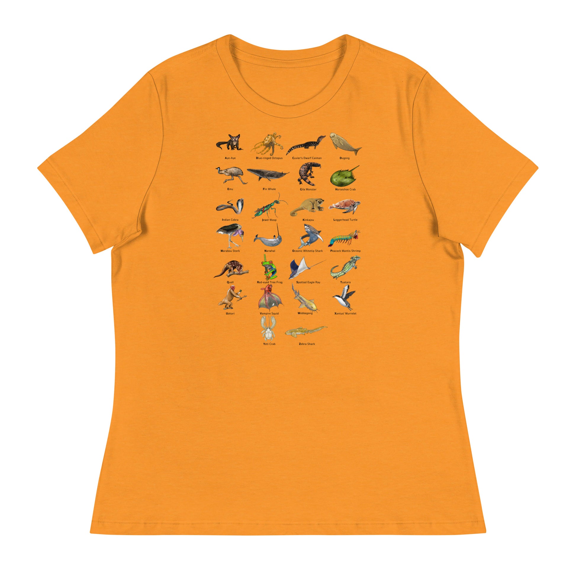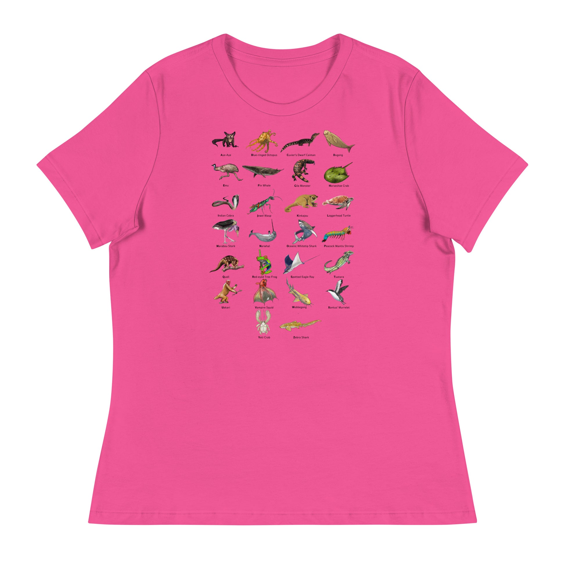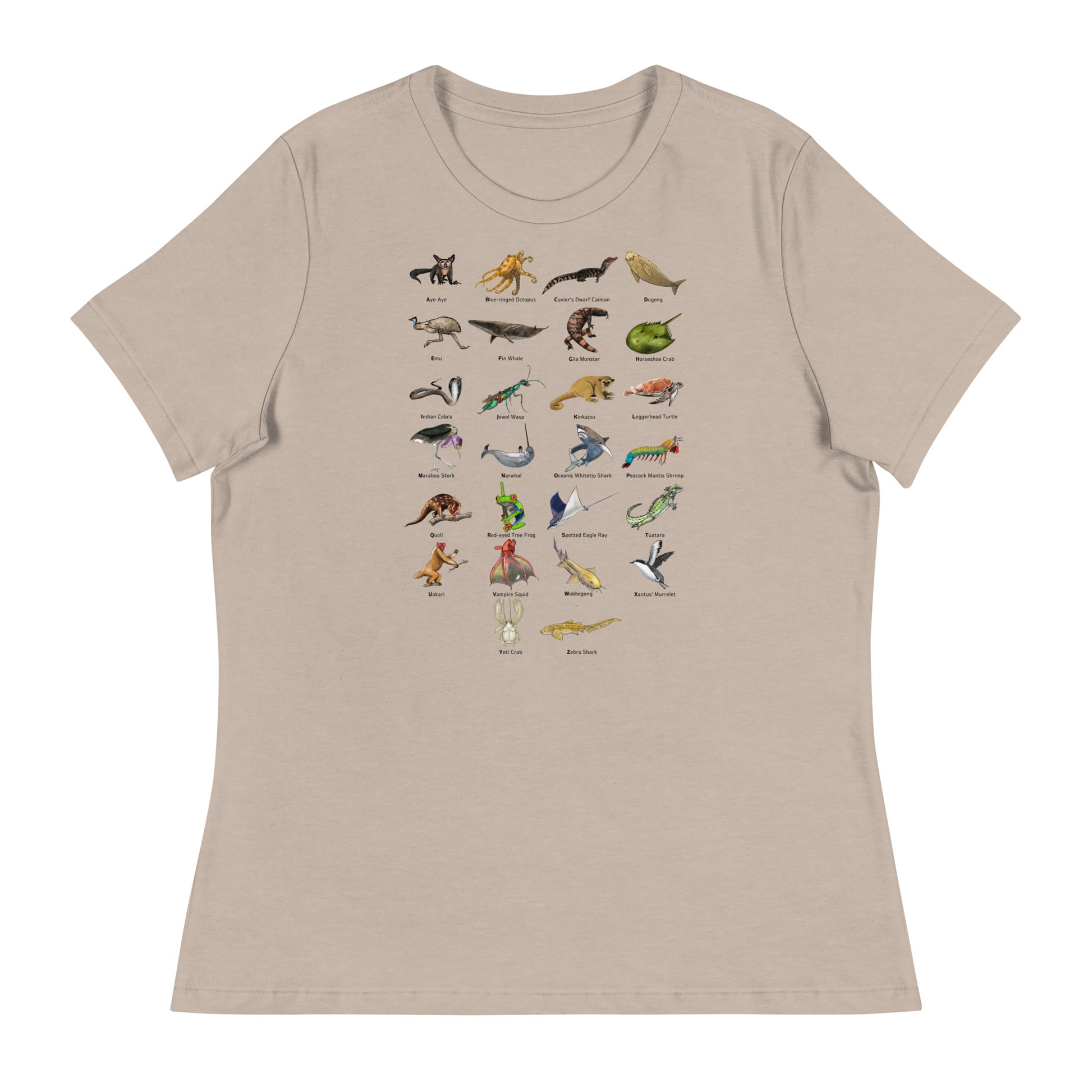 Introducing our extraordinary Animal Alphabet T-Shirt! Explore the world of wildlife like never before with this unique and educational design. Each letter of the alphabet is represented by a fascinating and lesser-known creature, from the mysterious Aye-Aye, known for its elongated middle finger used for insect hunting, to the cunning Jewel Wasp, which turns cockroaches into zombie slaves, and the enigmatic Vampire Squid, a deep-sea dweller with its otherworldly appearance.